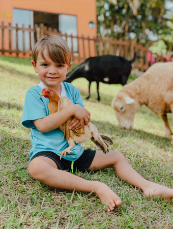 E vamos além! Somos uma Escola Fazenda que oferece às crianças contato real com os animais, o que gera mais de 10 benefícios comprovados em pesquisas, como: confiança, imunidade, empatia, auto responsabilidade, resolução de problemas e muito mais!